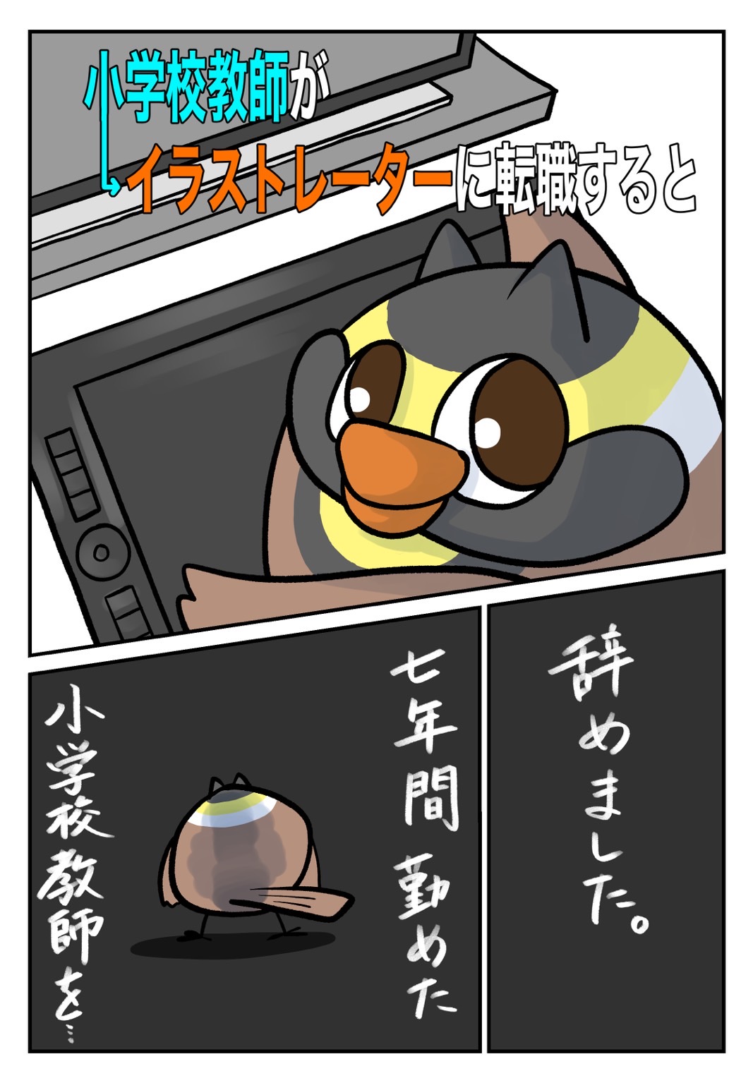2023.04.08 漫画 【マンガ】小学校教師がイラストレーターに転職すると 2022年3月31日に7年間勤めた小学校教員を退職しました。 2022年4月1日からフリーランスのイラストレーターとして活動を始めました。 小学校教師を続けていたら、きっと考えたり感じたりすることが出来なかったであろうことを、エッセイ漫画の様な形で皆さんに伝えていきたいと思います。 目次 はじめに 1 2 はじめに 1 2