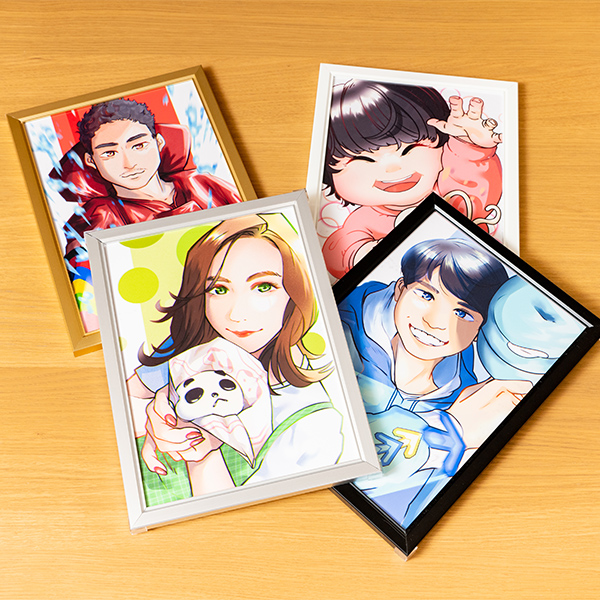 プレゼント用の似顔絵をお任せでご用意いたします。「B5サイズ、人物1人、額に入れて郵送」の項目が決まっており、そのほかの希望はプレゼントパックカルテに記載していただきます。その記載された内容をもとに2週間ほどお時間をいただき、絵を完成させて郵送いたします。依頼から納品までのやり取りが1回で済むので、気軽にご依頼いただけます。
